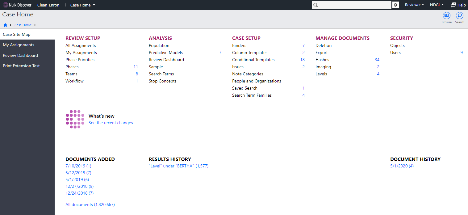 Feature sections: The features that appear in the Review Setup, Analysis, Case Setup, Manage Documents, and Security areas depend on your permissions and on your user category.